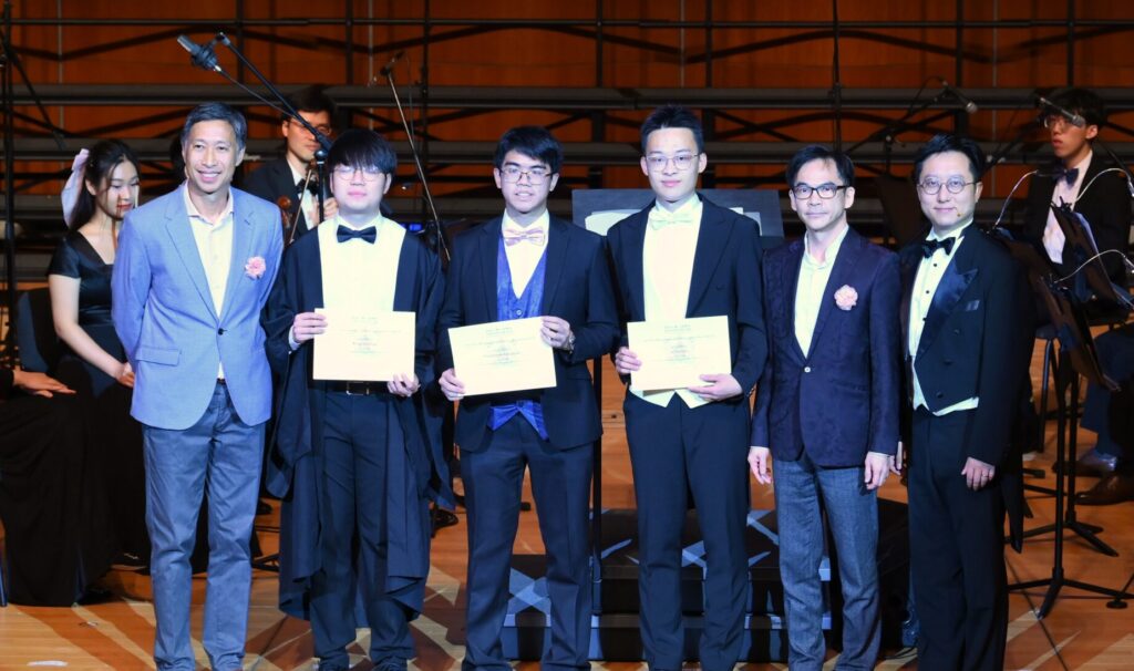 Photo from left: Professor Michael Ng; Mr Kevin Wong (Grand Prize winner in 2024-25); Mr Jayden Chan (Merit Prize awardee in 2024-25); Mr Peter Xi (Merit Prize awardee in 2022-23); Mr Johnny Ma SC; Mr Jeffrey Sham, Chairperson of HKU Law Alumni Choir Subcommittee and Conductor